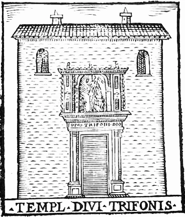Папа Гонорий IV указом от 20 февраля 1287 года пожаловал церковь Ордену Святого Августина. Туринский каталог 1320 года свидетельствует, что в то время церковь была папской капеллой и в ней cлужили двадцать пять монахов-августинцев. 11 апреля 1424 года августинцы торжественно перенесли в церковь мощи святой Моники, матери святого Августина, из их первоначального места упокоения в Остии. В последующем августинцы покинули церковь Сан-Трифоне, но храм остался. Об этом свидетельствует запись в каталоге церквей 1555 года и гравюра на дереве, выполненная Джироламо Франчино в 1588 году. Церковь снова упоминается в 1625 году как молельня Общества Святого Причастия Святого Августина.