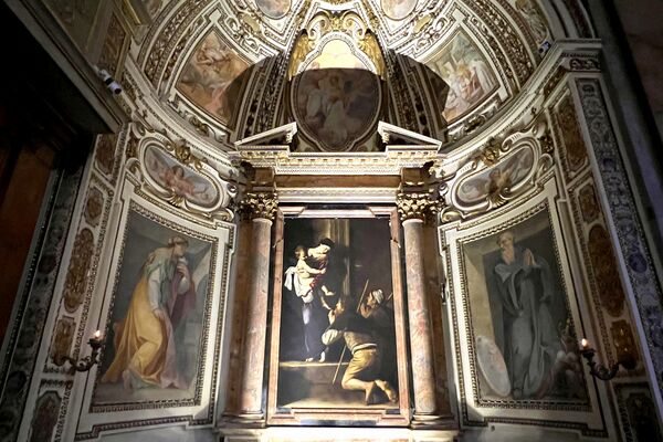 Своеобразная слава Сант-Агостино связана с тем, что в старину значительную часть прихожанок составляли представительницы древнейшей профессии. В капелле Кавалетти (первой капелле слева) находится знаменитая картина Караваджо «Мадонна ди Лорето», или Мадонна Лоретанская, получившая со временем более известное название «Мадонна Пилигримов» (Madonna del Pellegrini)[7]. Это одна из лучших картин художника, написанная им в 1604—1606 годах. Картина в качестве алтарного образа была заказана в 1603 году наследниками маркиза Эрмете Кавалетти для украшения семейной капеллы, приобретённой в Сант-Агостино по его завещанию.