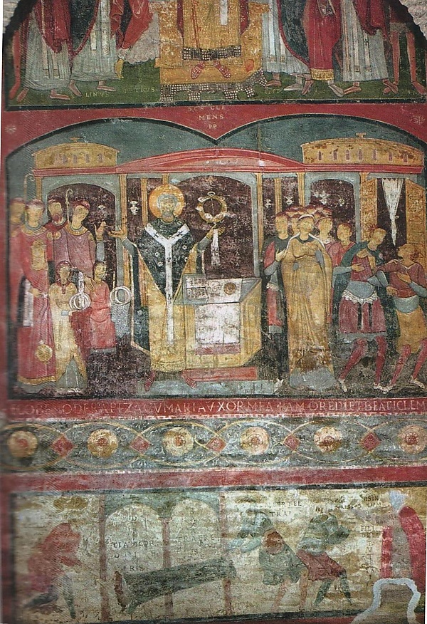 - верхний регистр — святой Климент восседает на престоле, ему предстоят его предшественники по римской кафедре: апостол Пётр, святые Лин и Клет. Все действующие лица подписаны, но их головы «отрезаны» полом «верхней» базилики.