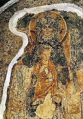 Хорошо сохранилась лишь одна фреска в нише, изображающая Богородицу с младенцем, а на боковых поверхностях ниши — святые Евфимия и Екатерина. В 1959 году отец Доминик Дарси, сравнивая эту фреску со знаменитыми мозаиками в равеннской церкви Сан-Витале, обнаружил поразительную сходство Богородицы из Сан-Клементе с равеннской императрицей Феодорой. Соответственно, выдвинута версия, что первоначально фреска представляла портрет Феодоры, муж которой Юстиниан сделал большие вклады в римские базилики, с двумя придворными дамами. В IX веке фреска была переосмыслена и дописана: Феодору посадили на трон, вручили младенца, и получившаяся фреска приобрела свой нынешний вид. На сегодня вопрос о первоначальном значении фрески остаётся дискуссионным.