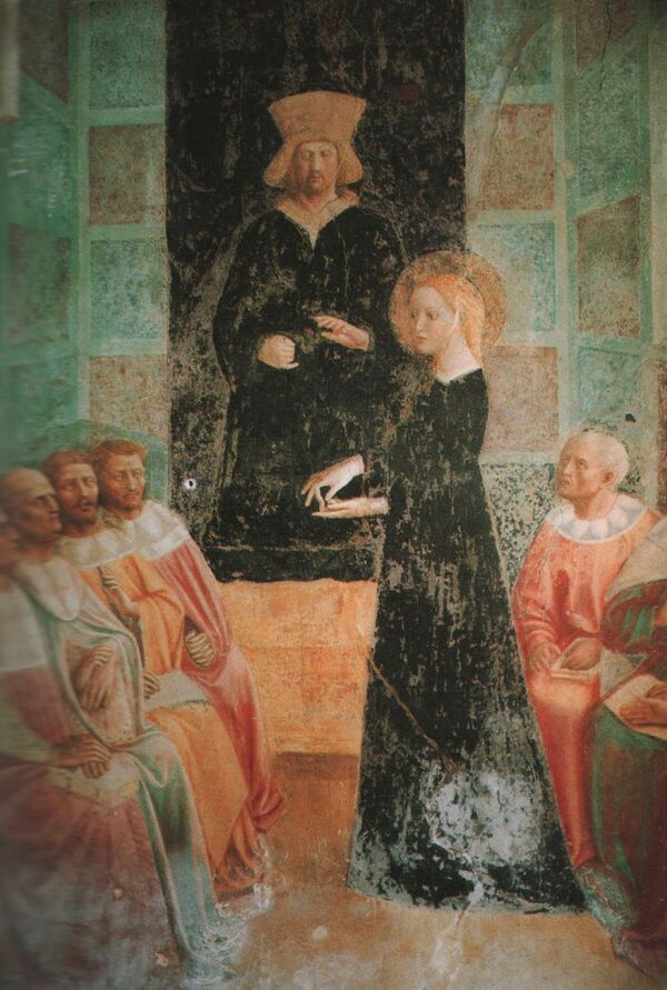 - верхний регистр, первая панель — Екатерина протестует против преследований христиан перед императором Максенцием;