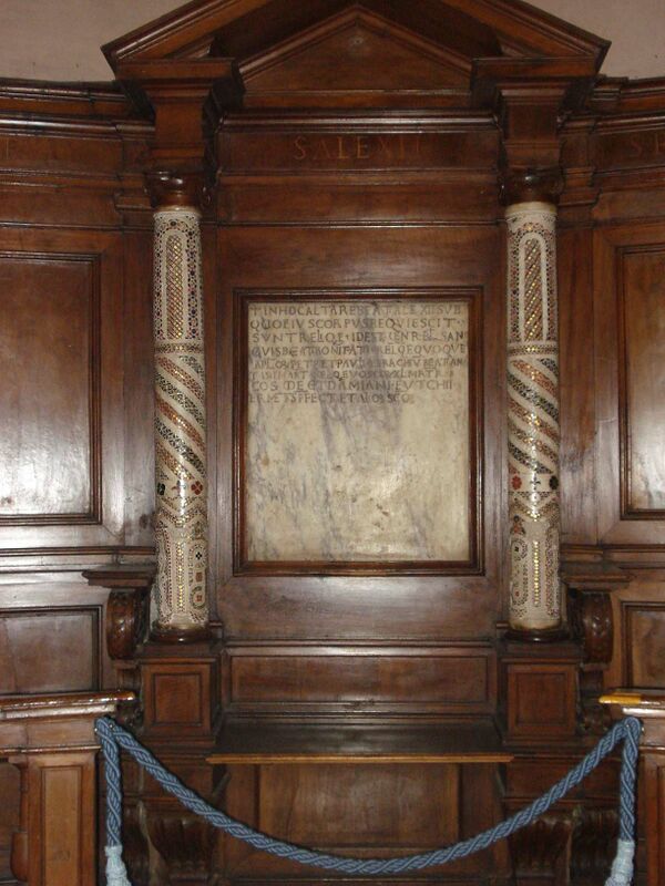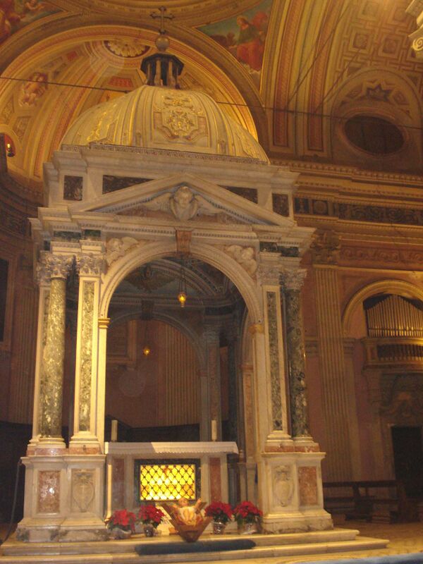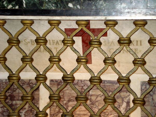 (14) На пересечении осей главного нефа и трансепта находится главный престол базилики. Под престолом в мраморном саркофаге почивают мощи святых Вонифатия и Алексия, о чём свидетельствует надпись «S BONIFATI MART(yr) S ALEXII CONFE(ssor)». Богато украшенный киворий, осеняющий алтарь, сооружён в конце XVI века, а престол приобрёл современный вид в результате перестройки середины XVIII века.