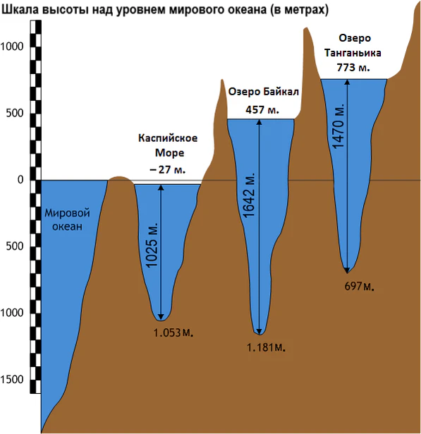 Если учесть, что водная гладь озера находится на высоте 456 м над уровнем моря, то нижняя точка котловины лежит на 1187 м ниже уровня мирового океана, что делает чашу Байкала также одной из самых глубоких материковых впадин[3].