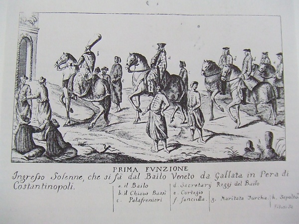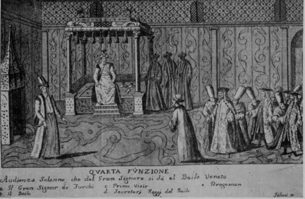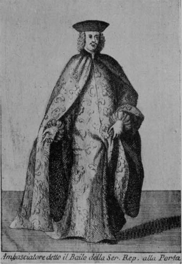 Свита байло состояла из секретаря, помогавшего в канцелярии, казначея, двух или более учеников-драгоманов (итал. giovani della lingua); старшего драгомана, который сопровождал байло в диван или на аудиенции, и младшего драгомана, помогавшего байло с перепиской[35].