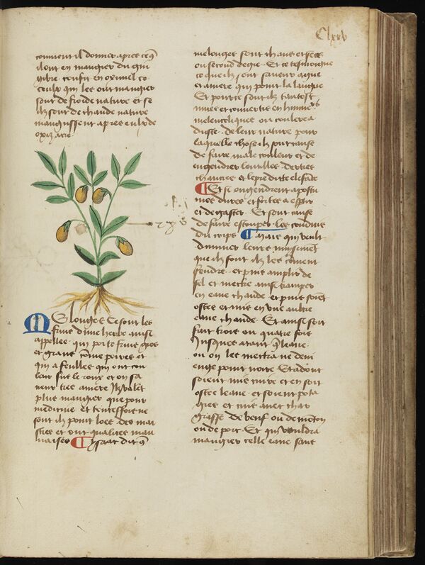 Слово мелонж под рисунком начинается с синей буквы М. Видовой эпитет растения — melongena — происходит от санскритского vatin ganah, которое дало названия этого плода на других языках: персидское بادنجان («ба̄динджа̄н») и арабское باذنجان («ба̄з̨инджа̄н», с определённым артиклем — «аль-ба̄з̨инджа̄н»). Из арабского языка слово попало в испанский как alberengena («альберенхе́на»), а оттуда перешло во французский как aubergine («обержи́н»). В латинском и итальянском языках ба̄з̨инджа̄н изменилось соответственно в melongena («мелонге́на») и melanzana («меланца́на»), которое ошибочно интерпретировалось как mela insana, «сумасшедшее яблоко». В португальском этот овощ назывался bringella («бринжелла»), и, благодаря активной торговле Португалии с Индией, это название «вернулось» на родину, но уже в форме «бринджал». В Вест-Индии португальское название изменилось как brown-jolly («бра́ун-джо́лли»)[6].