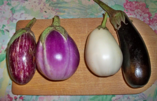 Различные по форме и цвету плоды разных сортов баклажанов: