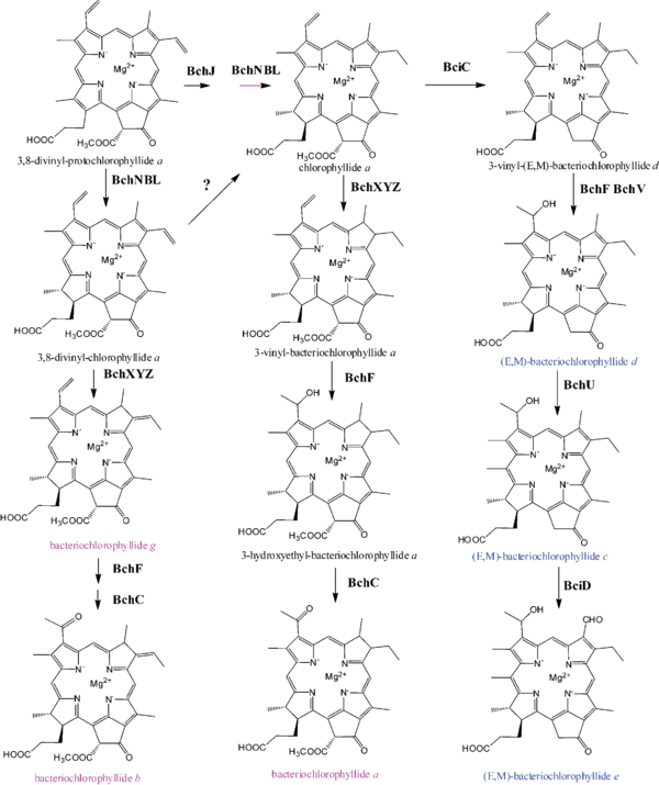 Упрощенная схема биосинтеза бактериохлорофиллидов a, b и g, а также (E,M)-бактериохлорофиллидов с-e[6][7], показана на рисунке.
