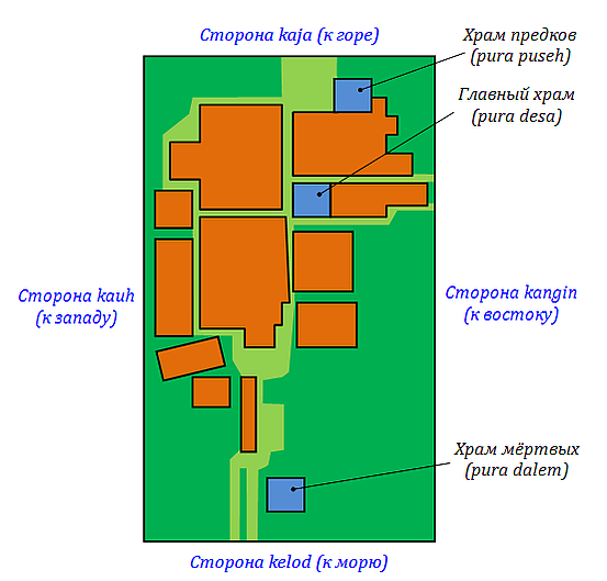Балийские деревни, как и балийские храмы, обычно расположены вдоль оси, проходящей между горами и морем. В каждой деревне есть три основных места поклонения — кахьянган тига (kahyangan tiga), которые служат религиозным нуждам общины. Эта система трех деревенских храмов по преданию была создана Мпу Кутураном (Mpu Kuturan), легендарным яванским священником, который реформировал балийский индуизм в XI веке: