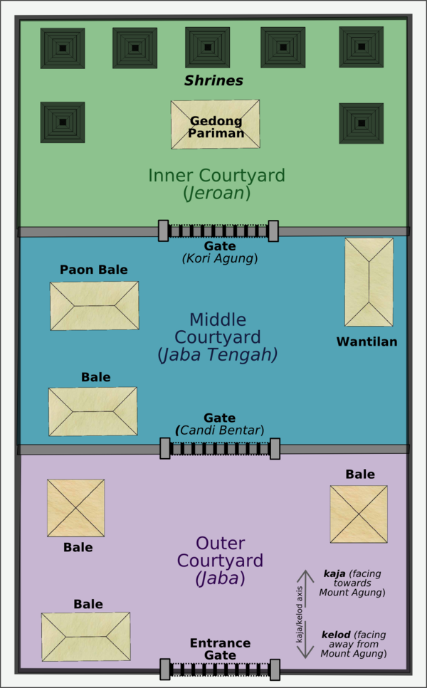 Архетипический балийский храм состоит из трёх окружённых стенами внутренних дворов, ориентированных по оси, идущей от гор к морю. Из одного двора в другой ведут украшенные ворота, и когда человек пересекает каждый порог, он поднимается на уровень выше. В символическом плане храмовый комплекс представляет собой метафору индуистского космоса — три двора, повторяющие трехчастную природу Вселенной, причем каждый восходящий уровень представляет более высокое состояние чистоты и святости.