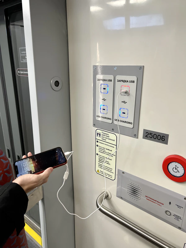 Изначально предполагалось, что салоны вагонов будут оснащены сенсорными интерактивными экранами со схемой метрополитена и USB-разъёмами[73], установка разъёмов была предусмотрена техническим заданием[74], которое допускается корректировать с течением времени[75]. Однако на презентации поезда 13 сентября[76] выяснилось, что Комитет по транспорту отказался от их установки[77]. Несмотря на это, губернатор города Александр Беглов на церемонии первого запуска поезда с пассажирами 12 ноября[78] объявил, что они появятся в новых вагонах, если так решат горожане в ходе опроса[79]. В конечном итоге 29 декабря 2022 года на Кировско-Выборгскую линию вышел первый поезд «Балтиец» с установленными в торцах его вагонов USB-разъёмами. Последующие составы также будут оборудованы USB-разъёмами[80].