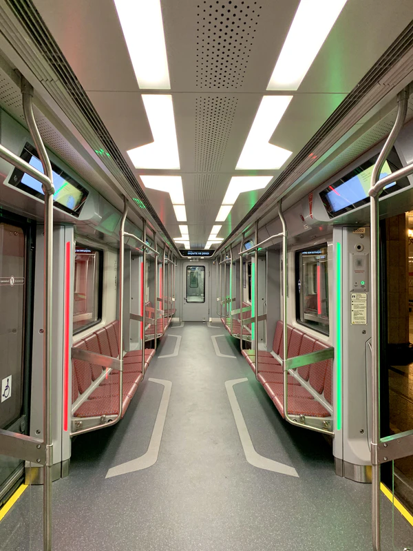 Салоны оснащены диодными лентами над дверьми, информирующие об открытии и закрытии дверей и жидкокристаллическими блоками информационных табло, установленными на потолках[15]. Несмотря на увеличенную площадь остекления салонов, торцы выполнены с «глухими» стенками (конкретно — пространства рядом с торцевой дверью лишены окон, что связано с проложенными кабелями для установки мониторов на торцевых стенках[71]). Блоки экстренной связи «пассажир-машинист» дополнены видеокамерами[72].