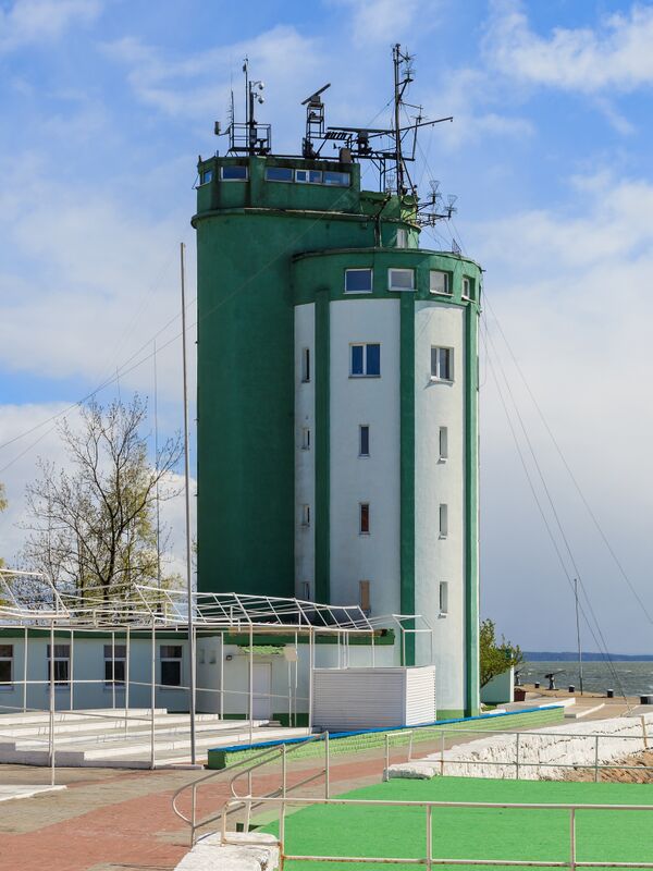 - Маяк (1813—1816). Первый деревянный маяк был построен в Пиллау в 1741 году, однако со временем стало ясно, что он плохо справляется со своими обязанностями, и было принято решение о строительстве нового большого каменного маяка. Сегодня балтийский маяк — самый западный в России. Был построен в начале XIX века. Автор маяка доподлинно неизвестен, по одной версии это известный архитектор Карл Шинкель, по другой — гидроинженер Шульц[44]. Высота маяка — 33,2 метра над уровнем моря. Огонь виден на расстоянии 16 морских миль. Изначально световой луч создавался за счёт горения растительного масла, которое в 1874 году было заменено на керосин. Затем использовались газовые лампы, а с 1913 года маяк перешёл на электрическое освещение. Во время войны маяк пострадал несильно, работы по его восстановлению закончились уже в сентябре 1945 года. Поскольку порт Пиллау (переименован в Балтийск 27 ноября 1946 года) стал местом базирования кораблей Балтийского флота, маяк пришлось срочно восстанавливать. Вначале здесь был зажжён временный огонь, а в 1953 году, после завершения строительства нового технического здания, маяк был полностью восстановлен. Источником огня в фонарном сооружении служил светооптический аппарат немецкой фирмы «Тейт Майер». Электропитание аппарата осуществлялось от отечественных дизель-агрегатов. Уже в советское время маяку был присвоен первый класс, а период маяка стал равен 12 секундам (три секунды темноты, девять секунд света). В настоящее время маяк светит белым затмевающимся огнём. Вместе с Передним Балтийским маяком, представляющим собой белый ромб и белую трапецию с чёрной вертикальной полосой на ажурной четырёхгранной башне, он обозначает створ 302,1°—122,1°, ведущий в морской канал порта Балтийск.[45]