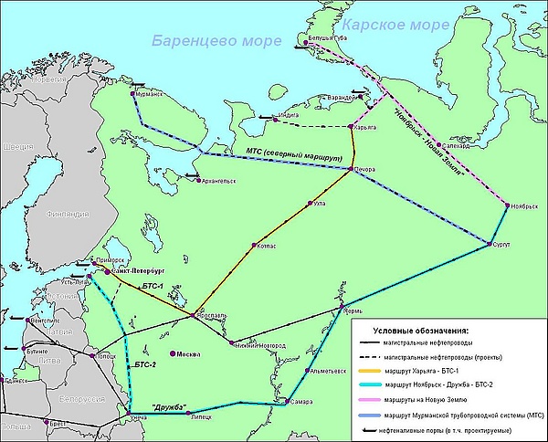 Наиболее разумной альтернативой выглядит создание танкерных терминалов на побережье Баренцева моря, в районах с благоприятными условиями для навигации. Такими районами являются Кольский полуостров (например, Мурманск, расстояние до нефтяных месторождений на севере Западной Сибири около 2000 км) и западное побережье архипелага Новая Земля (например, Белушья Губа, расстояние 1300 км).[6]