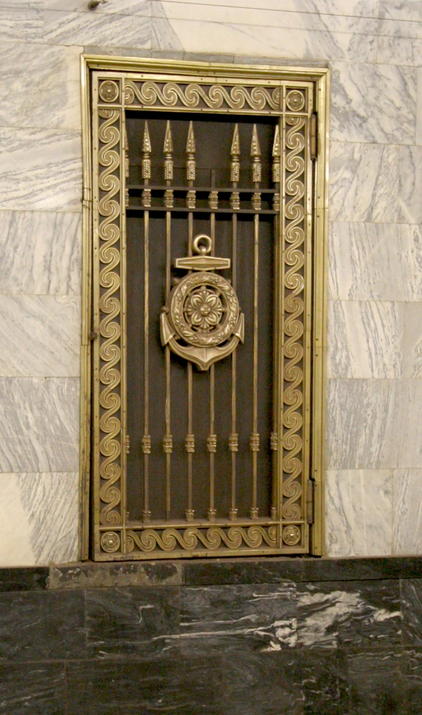 Между колоннами портика наземного павильона, в нише за колоннадой над входными дверями располагаются пять барельефов выдающихся русских флотоводцев: