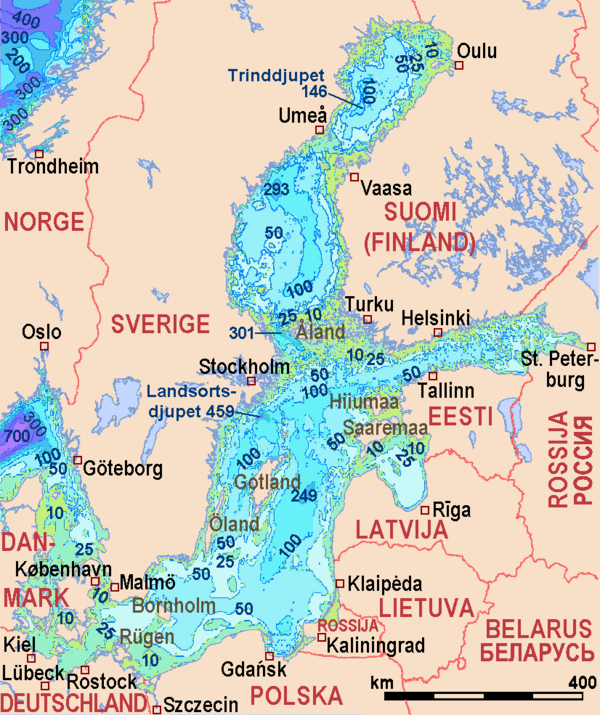 Балтийское море находится в пределах материкового шельфа. Средняя глубина моря 51 метр. В районах отмелей, банок, около островов наблюдаются небольшие глубины (до 12 метров). Имеется несколько котловин, в которых глубины достигают 200 метров. Самая глубокая котловина — Ландсортская (58°38′ с. ш. 18°04′ в. д.GЯO) с максимальной глубиной моря — 470 метров. В Ботническом заливе максимальная глубина — 293 метра, в Готландской котловине — 249 метров.