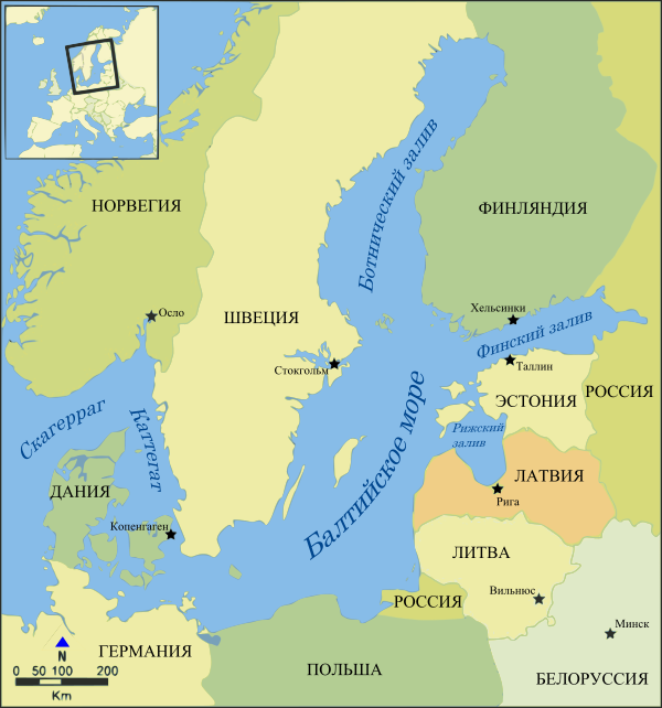 Балтийское море глубоко вдаётся в сушу Европы, омывает берега России, Эстонии, Латвии, Литвы, Польши, Германии, Дании, Швеции и Финляндии[5].