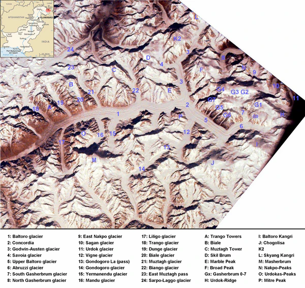 Ледник Балторо принимает более десятка крупных притоков, каждый из которых является в свою очередь сложным долинным ледником.
