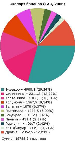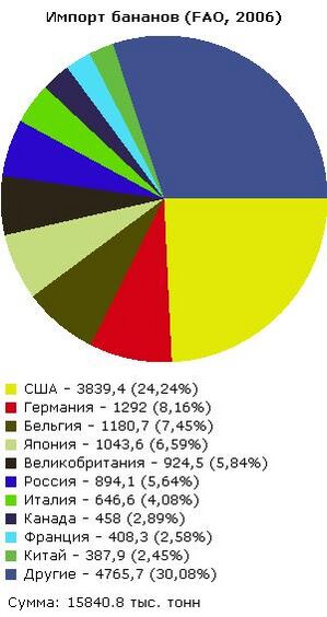 Однако по объёму продукции Индия и Китай, а также Филиппины занимают лидирующие позиции в мире — доля Индии составляет около 25 %, а доли Бразилии и Эквадора — по 9 % (средние показатели 2001—2005, ФАО)[29]. Около 80 % всего экспорта приходится на страны Латинской Америки — в основном это Эквадор (28,5 %), Коста-Рика (13,9 %), Колумбия (10,0 %) и Гватемала (5,8 %). Большой объём экспорта также приходится на Филиппины (11,7 %) (средние показатели 2001—2004, ФАО). Во многих островных государствах бананы приносят львиную долю доходов от экспорта — например, в Сент-Люсии она составляет почти половину (49,6 %). Основные импортёры продукции — Евросоюз (33,9 %), США (28,3 %) и Япония (7,1 %) (средние показатели 2001—2004, ФАО).