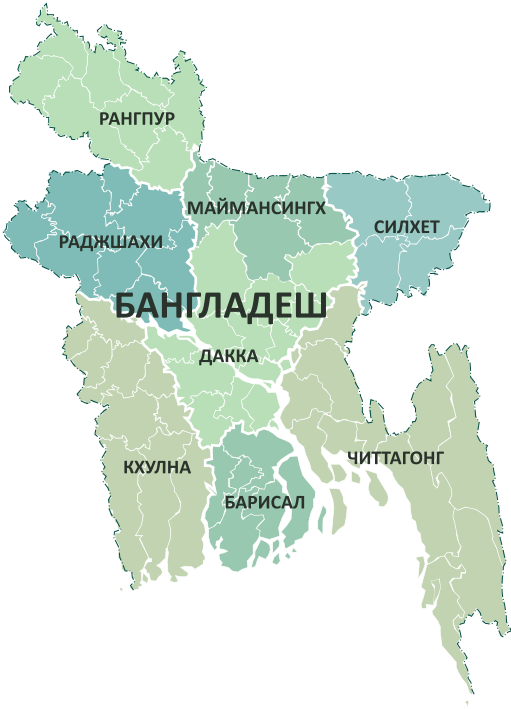 Бангладеш делится на 8 административных областей (дивизионов)[72][73], каждая из которых носит название крупнейшего города области: Барисал, Читтагонг, Дакка, Кхулна, Раджшахи, Силхет, Маймансингх и Рангпур.