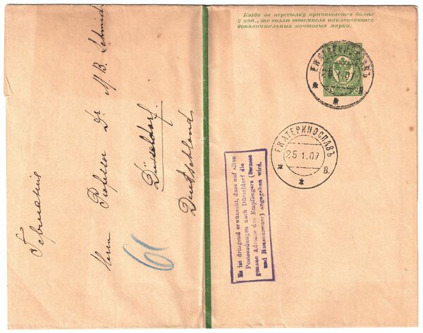 | Обычный бумажный конверт (2007): пометка от руки «п/б» («простая бандероль»); с наклеенными почтовыми марками России, выпущенными в 1998, 2001 и 2002 годах, для оплаты почтового сбора в размере 108 рублей 20 копеек |