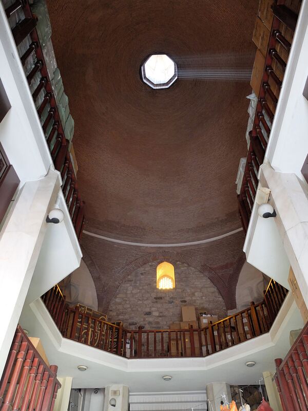 Раздевалку в мужской части, квадратную в плане и служащую ныне главным входом в здание, венчает самый большой купол здания, имеющий почти 17 метров в диаметре[1][3]. По углам купола расположены тромпы, украшенные мукарнами и похожие на купола хаммамов в Эдирне и Бурсе, возведённые примерно в то же время, что и бани Тахтакале[1]. Большая часть изначальных декоративных элементов не сохранилась и не могла быть восстановлена во время реставрации 1988 года[4]. Во внешнем виде бань Тахтакале выделяется характерный силуэт куполов со множеством световых отверстий и архитектурных фонарей[1].