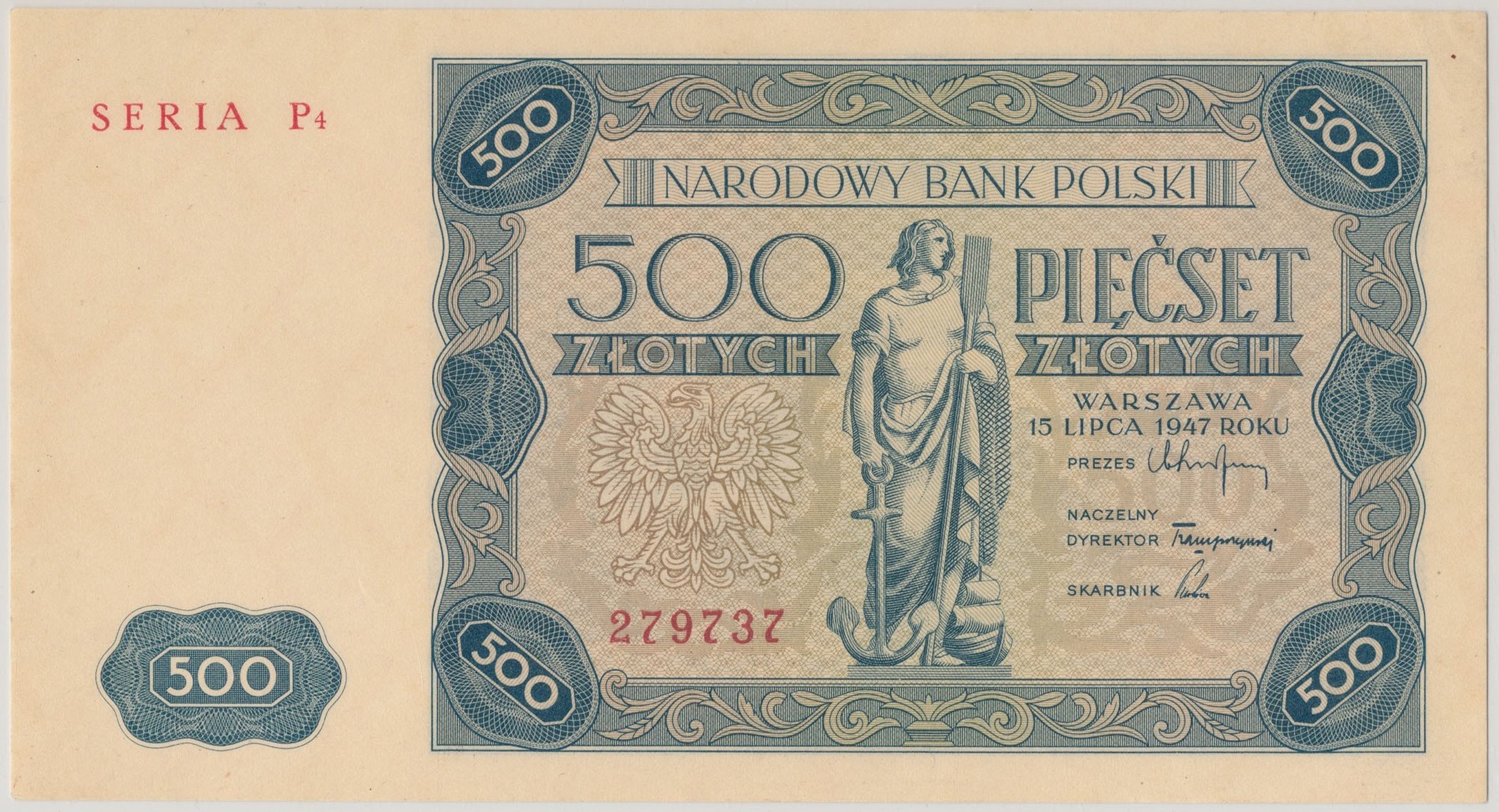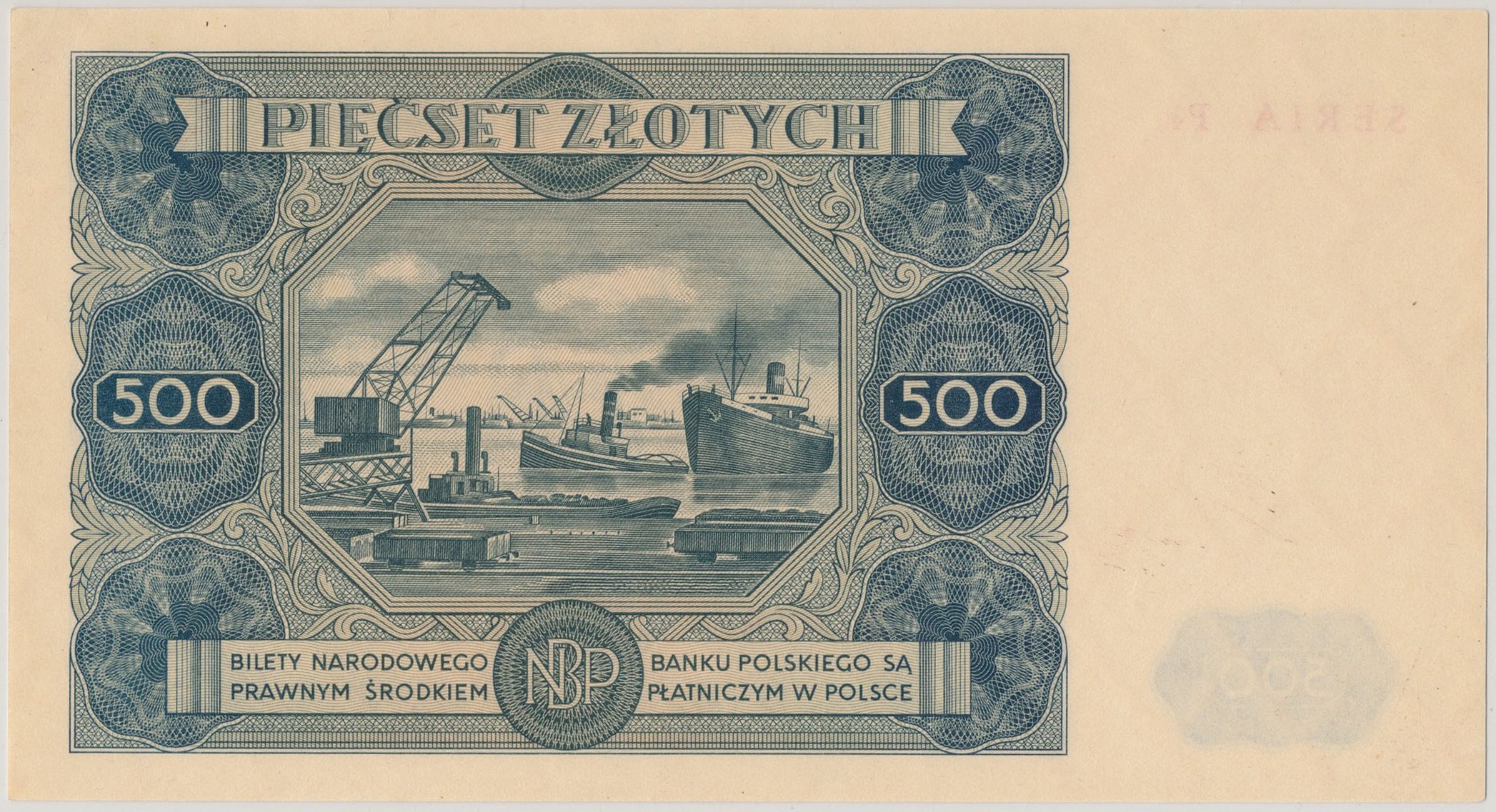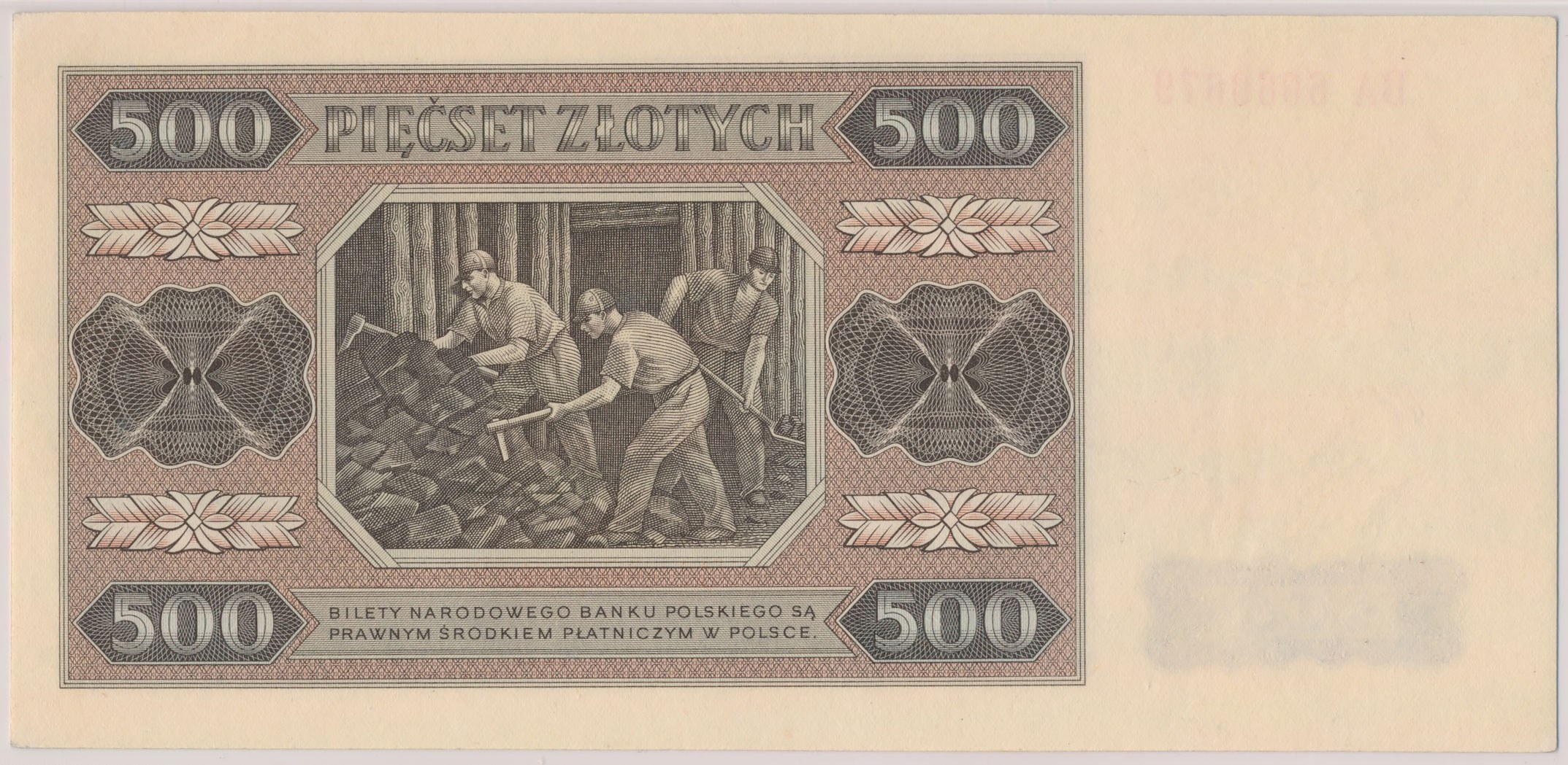 | 500 злотых | 176×94 | сине-зелёный | кораблестроитель и рыбак, герб Польши, название банка-эмитента, номинал, дата и место выпуска, подписи |