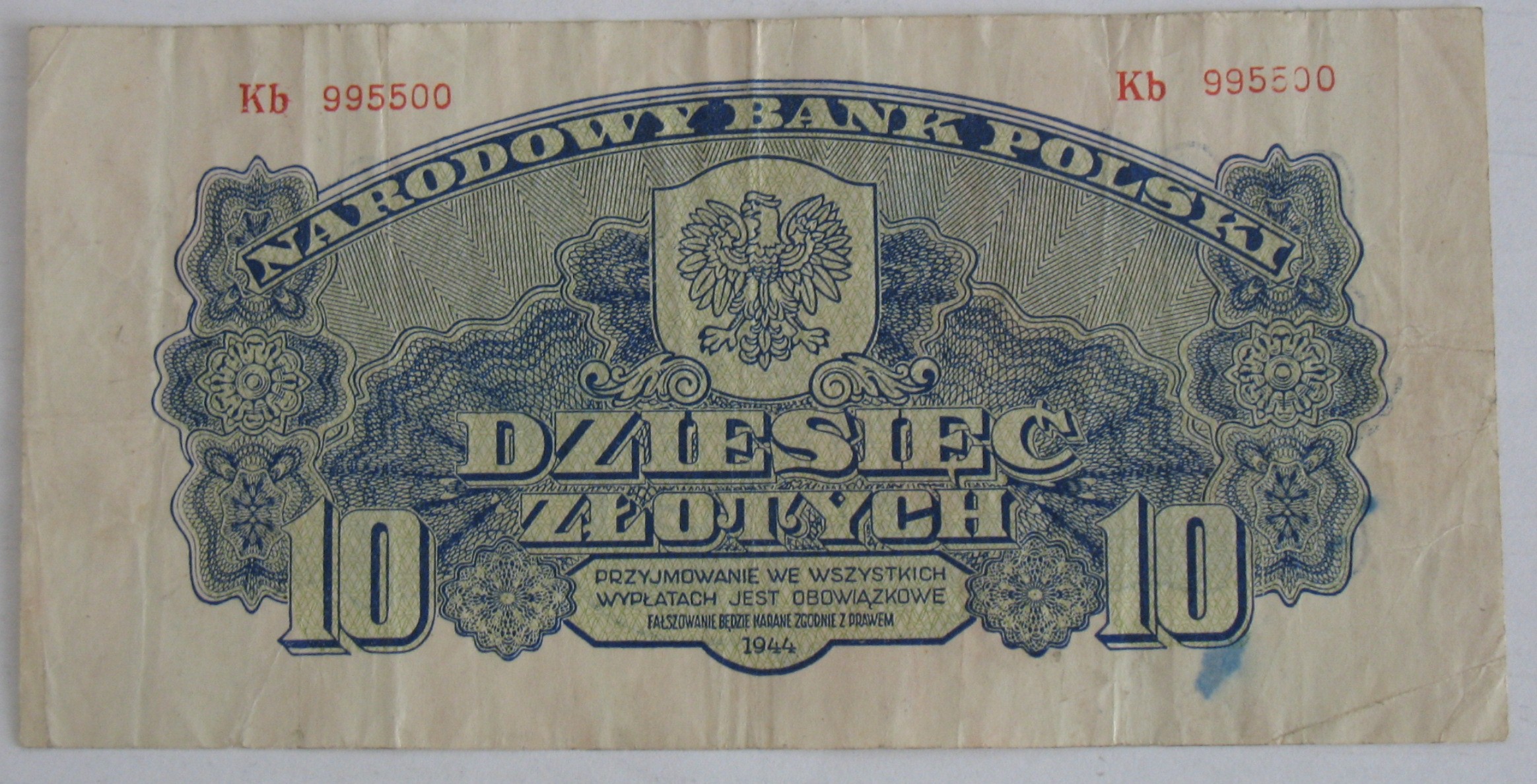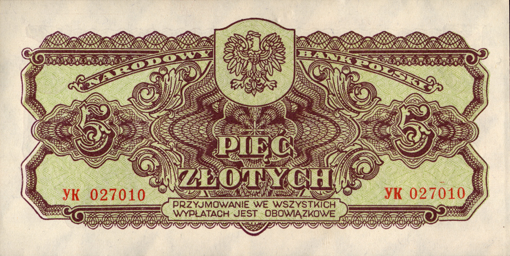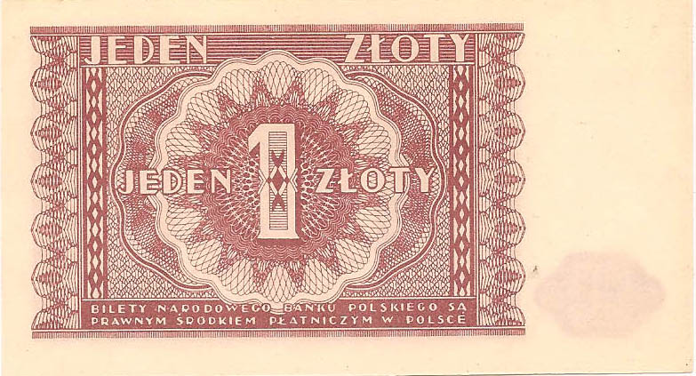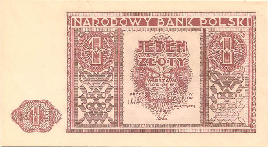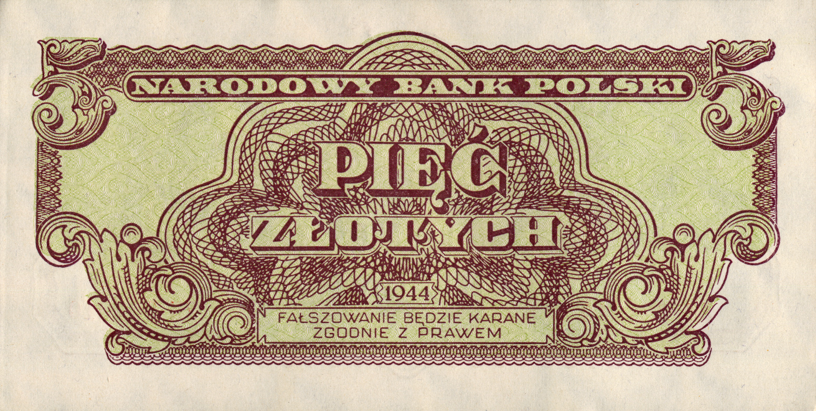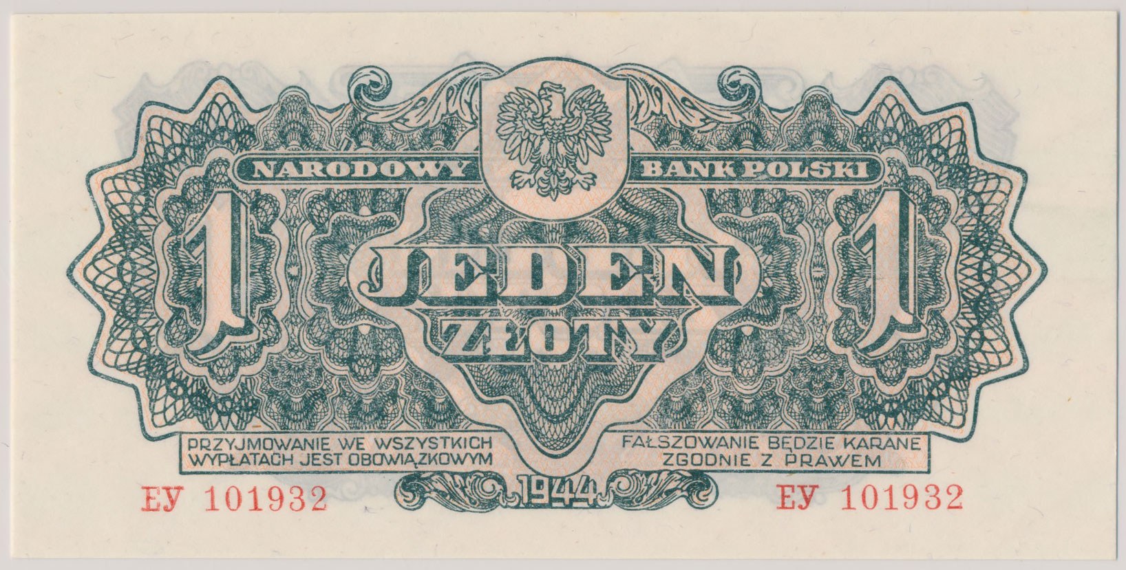 Первые после освобождения Польши банкноты были выпущены в обращение согласно декрета Польского комитета национального освобождения от 24 августа 1944 года. Первоначально они печатались на типографии Гознака в Москве. На этих банкнотах номиналом от 1 до 500 злотых в пояснительной надписи на польском языке была допущена ошибка: во фразе польск. PRZYJMOWANIE WE WSZYSTKICH WYPŁATACH JEST OBOWIĄZKOWE последнее слово было передано как OBOWIĄZKOWYM. Позднее банкноты с этой же датой стали печататься на типографии Народного банка Польши и ошибка была исправлена.