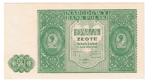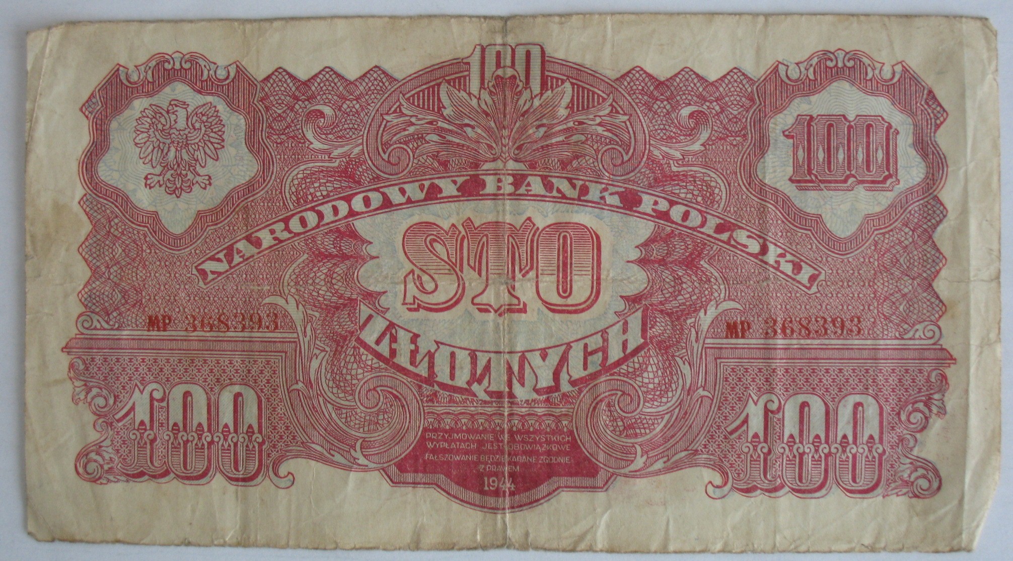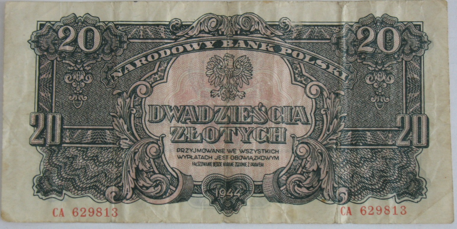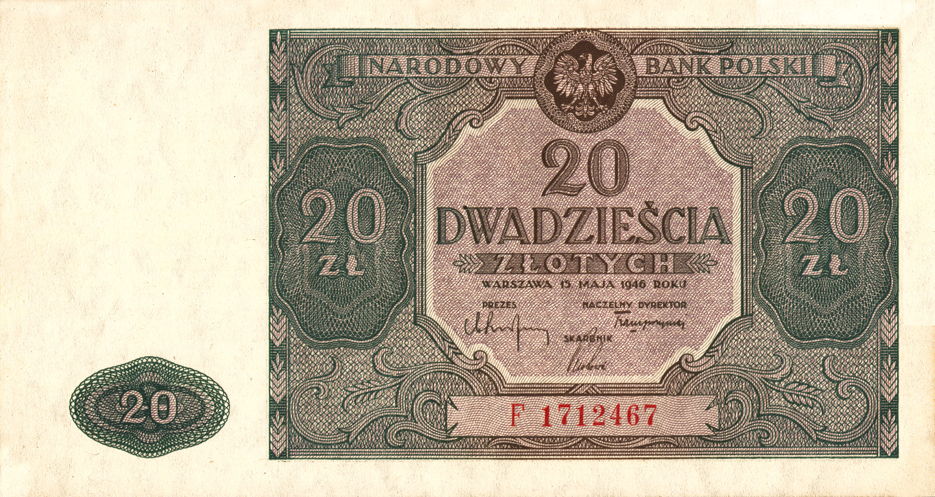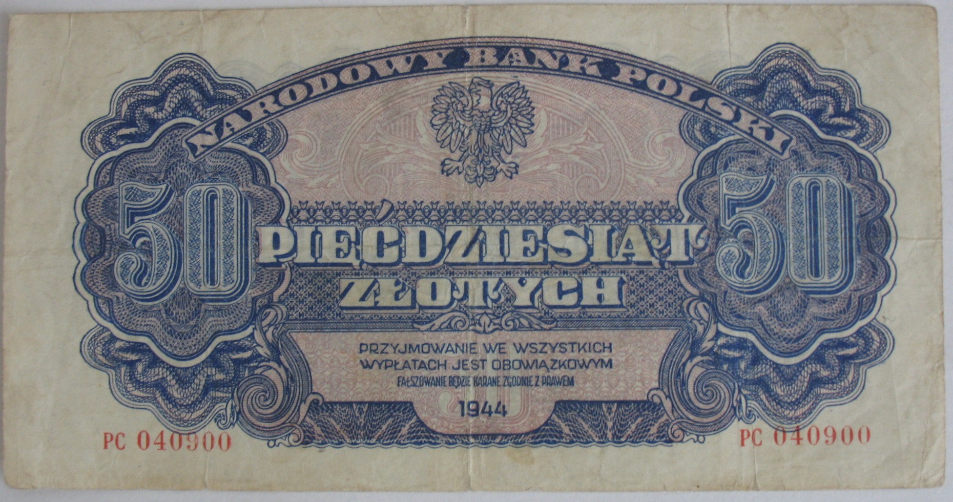 Первые после освобождения Польши банкноты были выпущены в обращение согласно декрета Польского комитета национального освобождения от 24 августа 1944 года. Первоначально они печатались на типографии Гознака в Москве. На этих банкнотах номиналом от 1 до 500 злотых в пояснительной надписи на польском языке была допущена ошибка: во фразе польск. PRZYJMOWANIE WE WSZYSTKICH WYPŁATACH JEST OBOWIĄZKOWE последнее слово было передано как OBOWIĄZKOWYM. Позднее банкноты с этой же датой стали печататься на типографии Народного банка Польши и ошибка была исправлена.