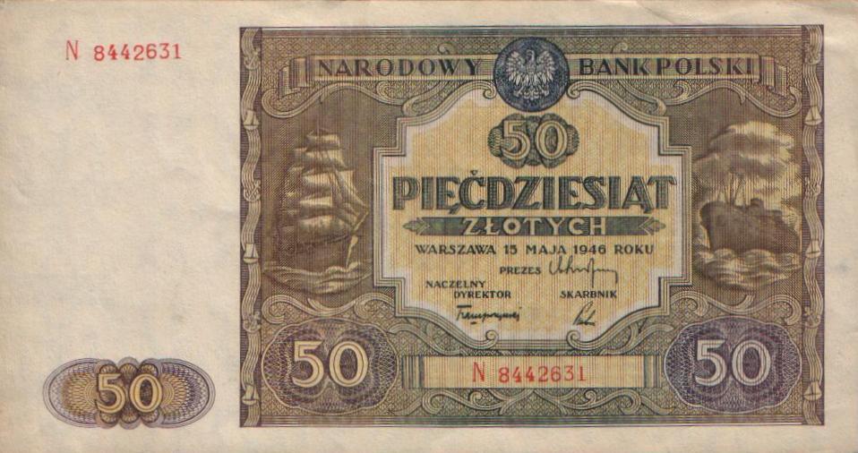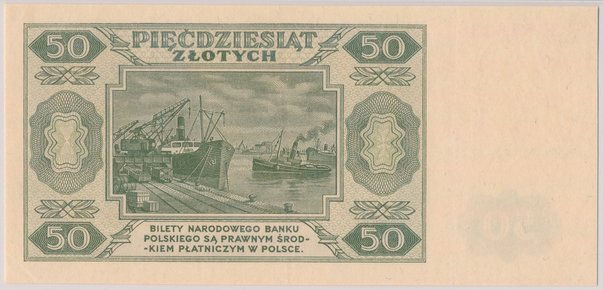 | 50 злотых | 164×87 | коричневый | парусник и теплоход, герб Польши, название банка-эмитента, номинал, дата и место выпуска, подписи |