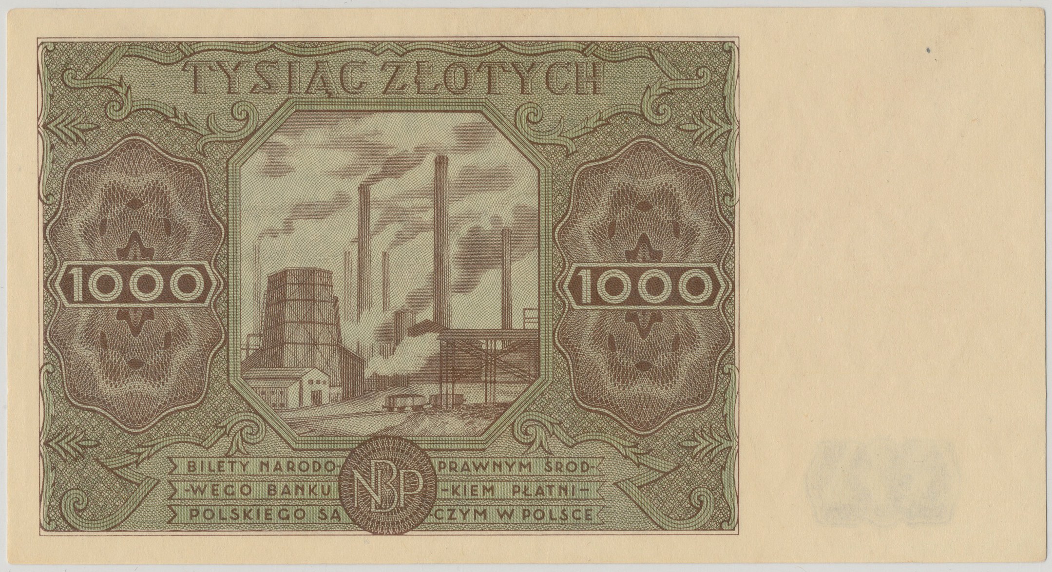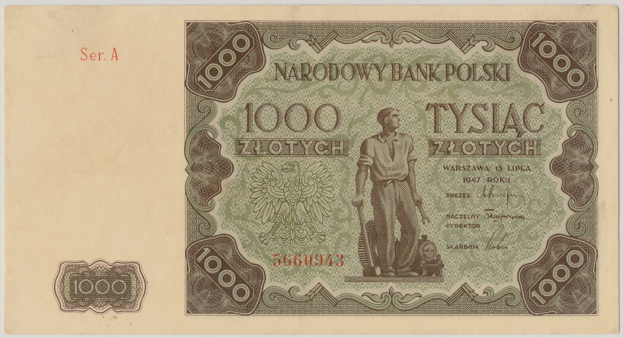 | 1000 злотых | 182×97 | коричневый | шахтёр и рабочий, герб Польши, название банка-эмитента, номинал, дата и место выпуска, подписи |