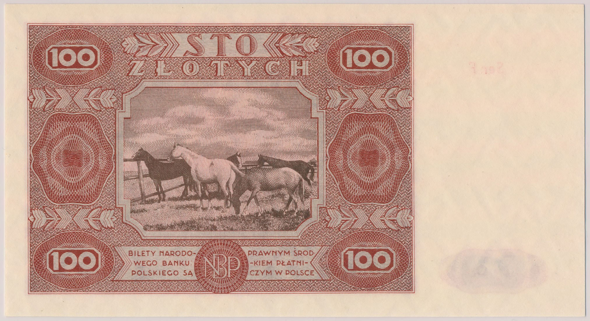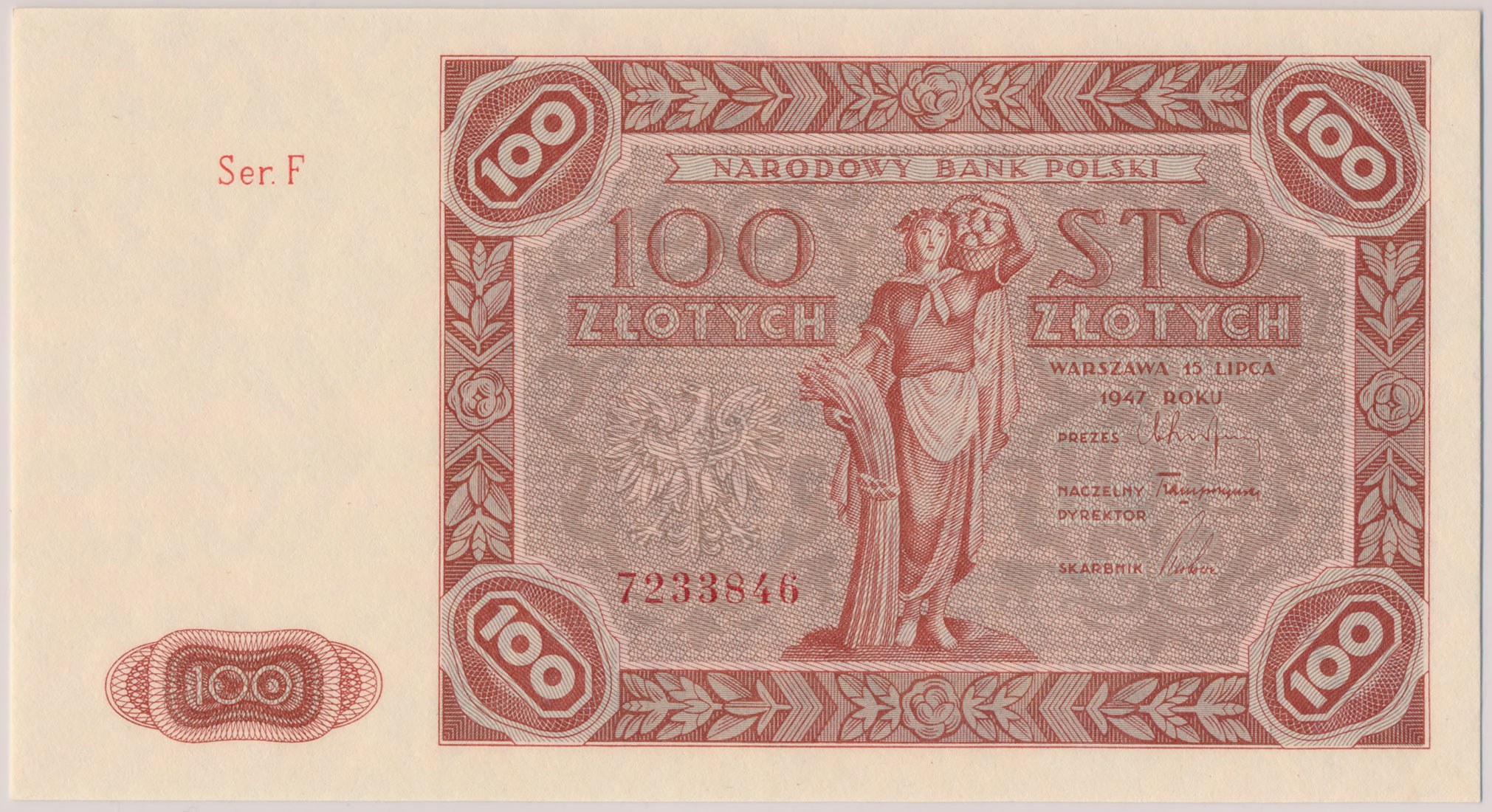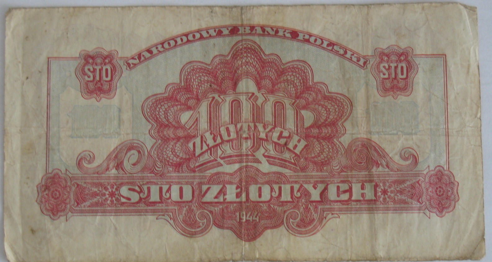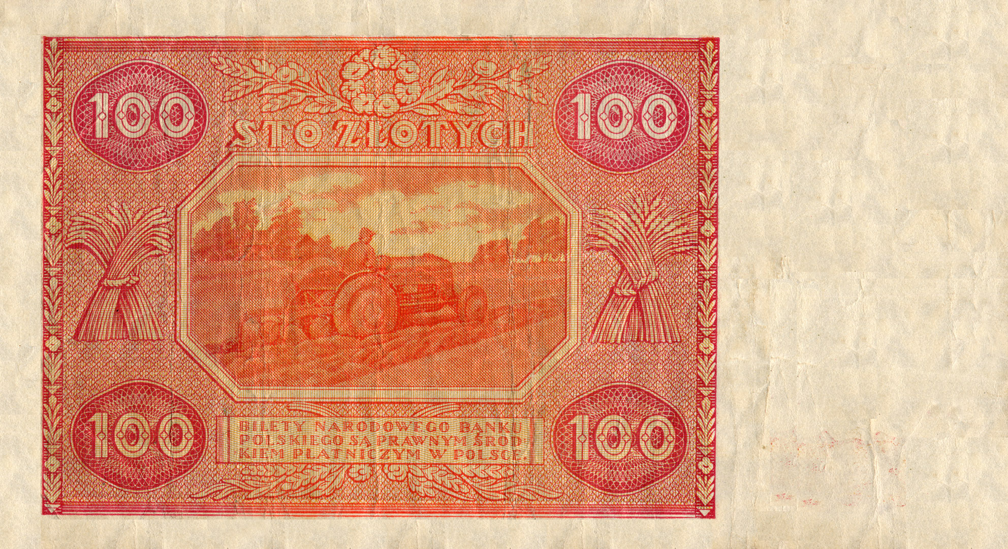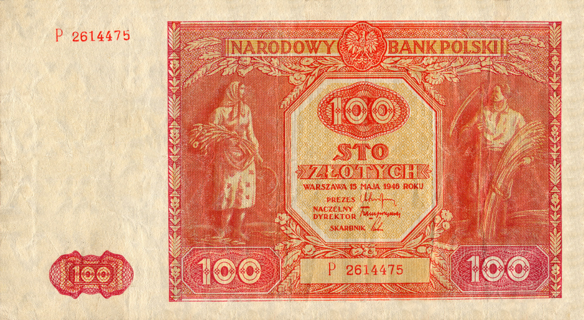 | 100 злотых | 170×91 | красный | крестьянин и крестьянка, герб Польши, название банка-эмитента, номинал, дата и место выпуска, подписи |