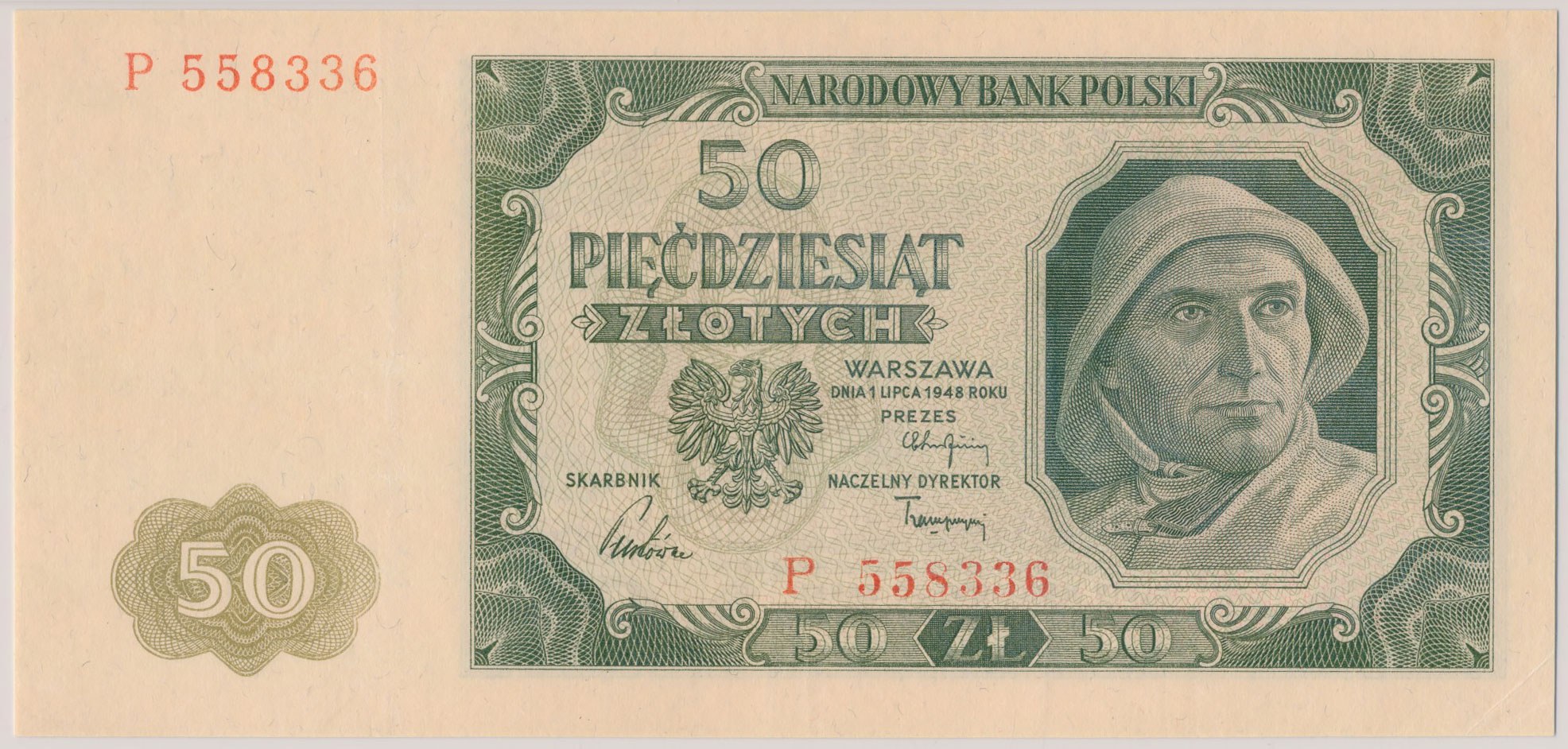 | 50 злотых | 164×78 | оливковый | портрет рыбака, название банка-эмитента, номинал, дата и место выпуска, подписи |