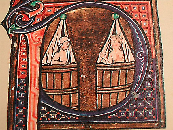 С ростом городов Европы в IX—X вв. в них появились публичные банные комплексы[10], где можно было мыться с мылом, стричь волосы, бриться, ставить пиявки. Люди собирались в банях столь же естественно и часто, как и в церкви; и рассчитаны были эти купальные заведения на все классы, так что их облагали сеньориальными пошлинами наподобие мельниц, кузниц и заведений питейных[11]. В такого рода заведении купались в индивидуальной деревянной ванне или в общем бассейне, но бывали и специальные парилки, где воздух нагревался горячими камнями, а клиенты лежали не в воде, а просто на лавках[12]. От античных врачей средневековые унаследовали представление о пользе парилки для здоровья; например, святая Хильдегарда Бингенская, писавшая в XII в. труды по медицине, советовала при болезнях пить в бане отвары лекарственных растений (петрушки, тимьяна, ромашки, пижмы, мяты, лаванды, розмарина и др.) и одновременно поддавать ими на раскалённые камни и дышать этим паром[13].