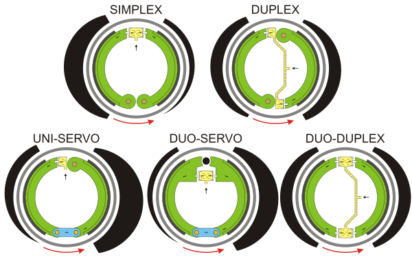 В простейшем барабанном тормозе с двумя колодками и общим толкателем колодки работают несимметрично, так как сила трения вклинивает одну из них между барабаном и толкателем, а вторую между барабаном и жёстким упором. Если на первой колодке тормозное усилие растёт пропорционально давлению толкателя, то на второй возрастает гораздо быстрее, хотя и нелинейно. При верхнем расположении толкателя и движении вперёд с усилением действует передняя колодка, которая называется набегающей в противоположность к задней, соответственно, вторичной тормозной колодке. Водителю достаточно легкого нажатия, чтобы набегающая колодка коснулись барабана, после чего эффект «затягивания» начинает работать как своеобразный «усилитель». Для повышения эффективности, барабанные тормоза могут оснащаться симметричной парой толкателей, связанных через жёсткую тягу или гидравлически: эффективность такого тормоза повышается за счёт «затягивания» обеих колодок вслед за барабаном. Контролировать торможение становится сложнее, но замедление значительно увеличивается, а необходимое усилие на педали или ручке тормоза уменьшается. Данный момент был весьма серьёзным плюсом до внедрения усилителей тормозов, так как на дисковых тормозных механизмах такого эффекта нет (тормозной диск вращается в направлении, перпендикулярном к направлению действия тормозного усилия). С появлением вакуумных и гидравлических усилителей тормозов более важным моментом стала пропорциональность замедления усилию на педали, что позволяет более точно контролировать торможение — сейчас барабанные тормоза если и применяются, то по другим причинам, а конструкции с парой толкателей фактически не используются.