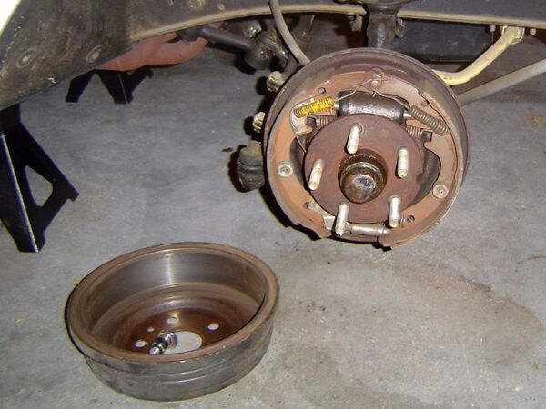 Барабанный тормоз — фрикционный тормоз, осуществляющий торможение за счёт сил трения между внутренней поверхностью вращающегося цилиндра (барабана) и расположенными внутри цилиндра неподвижными тормозными колодками.[1][2] В общем случае состоит из тормозного барабана, тормозных колодок, опорного диска с опорами для колодок, разжимного устройства и регулятора зазоров.[3]