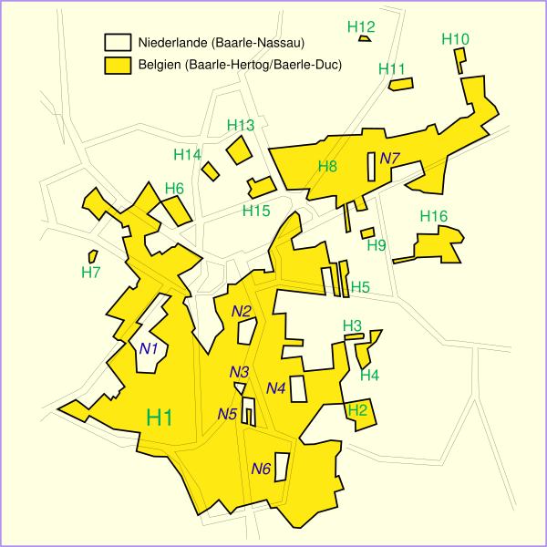 Барле (нидерл. Baarle) — посёлок, разделённый между Бельгией (коммуна Барле-Хертог (нидерл. Baarle-Hertog)) и Нидерландами, с населением более чем 9000 жителей. Бельгийская часть посёлка состоит из 22 анклавов, окружённых территорией Нидерландов. Барле-Хертог официально входит в состав бельгийской провинции Антверпен. Нидерландская часть посёлка называется Барле-Нассау (нидерл. Baarle-Nassau) и относится к провинции Северный Брабант. Часть нидерландской территории, в свою очередь, приходится на анклавы, расположенные внутри бельгийских анклавов. Общее число таких «анклавов-матрёшек» составляет семь. Рядом с расположенной неподалёку бельгийской деревней Зондерейген (Zondereigen) находится ещё один (не имеющий населения) нидерландский анклав. Таким образом, Нидерланды имеют восемь анклавов. В 1998 году официальная комиссия по государственной границе провела разметку границы. При этом нейтральный до этого кусочек луга был передан Бельгии. Таким образом, количество бельгийских анклавов на нидерландской территории достигло двадцати двух.