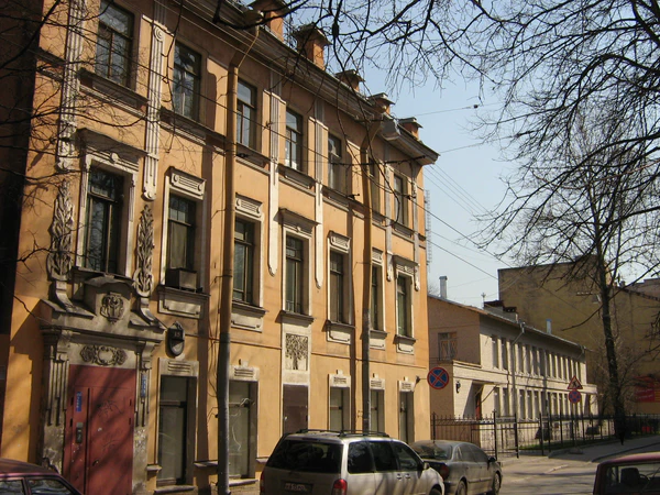 - Трёхэтажный дом № 7 выходит двухэтажным фасадом на параллельную Плуталову улицу (неофициальный адрес — Плуталова, 23: особняк С. М. Соловьёва, арх. А. И. Ковшаров, 1904 год), а на Бармалееву — низенькой аркой, ведущей во двор. В этой части здания, построенной по проекту И. Ф. Безпалова в 1908 году в неорусском стиле, находилась скульптурная мастерская З. В. Мариной.[12] В советские годы эта часть здания была перестроена в конструктивистском стиле.