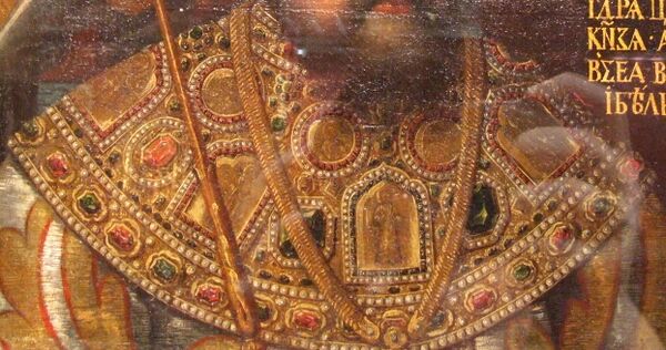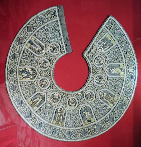 - Древние шитые бармы царя Михаила Фёдоровича. Ткань — атлас, XII в., Италия. Шитьё: 1629—1645, Россия.