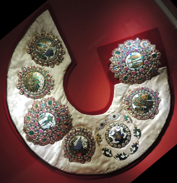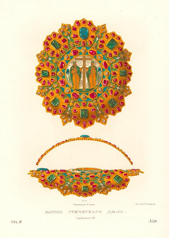 Бармы состоят из 7-ми драгоценных эмалированных металлических медальонов-запон, обильно украшенных драгоценными камнями.