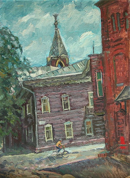 На картине представлен городской пейзаж с тщательно проработанной композицией. В правой части на переднем плане изображён угол трёхэтажного красного здания, за которым тянется улица с едущим по ней велосипедистом. На противоположной стороне улицы находится двухэтажное деревянное сиреневое здание, над крышей которого возвышается вытянутый пирамидообразный купол. Атмосфера солнечного дня подчёркнута голубым небом с лёгкими белыми облаками, что придаёт работе ощущение простора и света.