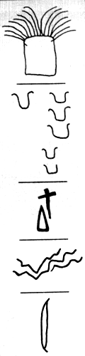 В некоторых коридорах и камерах обнаружены вырезанные на камнях символы — изображения луков, топоров, волн, змей, П-образные знаки. Один из камней с вырезанными рисунками первоначально был частью другого сооружения; подобное же повторное использование камней наблюдалось и в ряде других памятников, например, Гаврини.