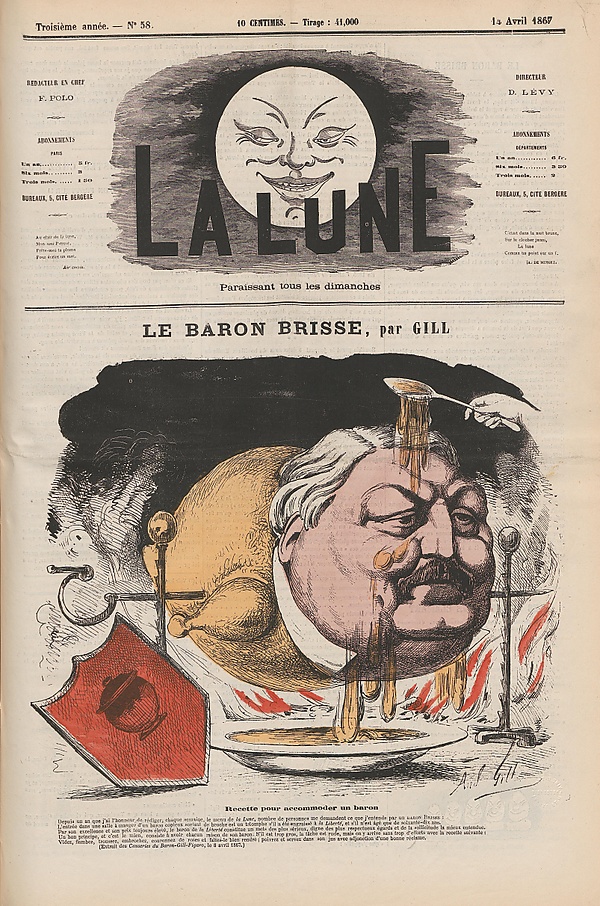 Известный своей любовью к хорошей еде и внушительной полнотой, он состоял во многих гастрономических обществах и общался со всеми великими шеф-поварами своего времени, такими как Жюль Гуффе[5]. В частности, он стал владельцем отеля Scribe на бульваре Капуцинок в Париже[6]. 14 апреля 1867 года он попал на передовицу газеты La Lune с карикатурой Андре Жиля, озаглавленной «Рецепт приготовления барона» (фр. Recette pour accommoder un baron), что обыгрывало дворянский титул Брисса и термин, обозначающий крупный кусок мяса (бароний отруб).