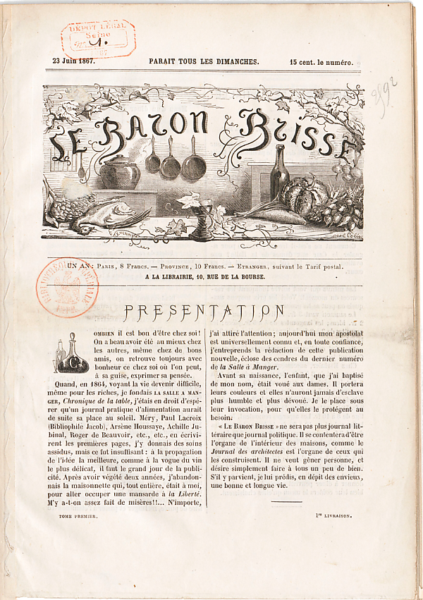 Став по-настоящему знаменитым, он использовал материалы своих хроник для публикации в 1867 году книги «366 меню барона Брисса» (фр. Les Trois Cent soixante-six menus du Baron Brisse). В июне 1867 года он возродил La Salle à manger под названием Le Baron Brice, но выпуск прекратился через год. 23 июня 1867 года он повторил попытку с листком под названием Le Baron Brisse, который постигла та же участь в следующем году.