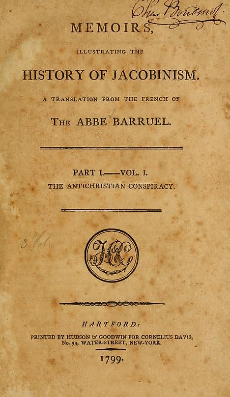 • Mémoires pour Servir à l’Histoire du Jacobinisme, Hambourg, 5 vol., P. Fauche, 1798—1799. Rééditions: Hambourg, P. Fauche, 1803; Édition Revue et Corrigée, 1818; Abrégé par E. Perrenet éd. Paris, La Renaissance française, 1911; avec un introduction de Christian Lagrave, Diffusion de la pensée française, "Les Maîtres de la Contre-révolution, " 1974; Extraits sous le titre: Spartacus Weishaupt, Fondateur des Illuminés de Bavière, Ventabren, Les Rouyat, 1979; Pergamon press, "Les archives de la Révolution Française, " 1989; Éditions de Chiré, "Les Maîtres de la Contre-révolution, " 2 t., 2005.