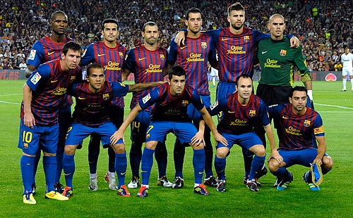 «Барселона» перед матчем за Суперкубок Испании 2011. Верхний ряд (слева направо): Эрик Абидаль, Педро Родригес, Хавьер Маскерано, Серхио Бускетс, Жерар Пике, Виктор Вальдес. Нижний ряд (слева направо): Лионель Месси, Дани Алвес, Давид Вилья, Андрес Иньеста, Хави.
