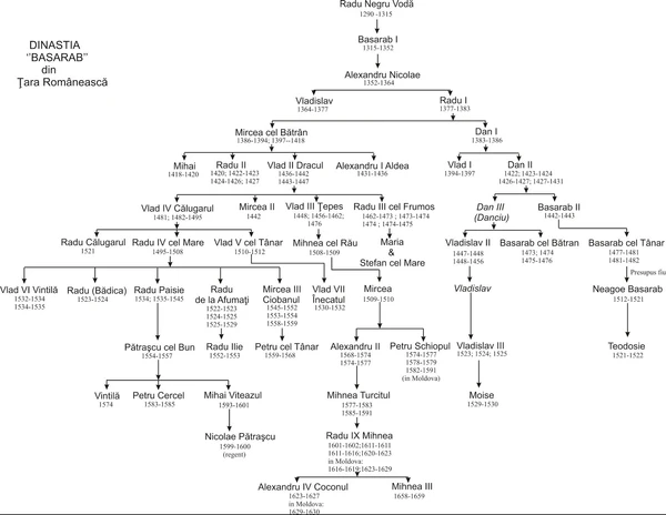 В XV веке династия Басарабов разделилась на две конкурирующие ветви — старшая носила название Данешти (в честь основателя, Дана I), а младшая — Дракулешти (в честь Влада II Дракула, чьим отцом был Мирча Старый, великий воевода Иоанна Шишмана). Престолонаследие с годами становилось всё более хаотичным, ибо власть передавалась не от отца к сыну, а легитимировалась боярским советом (хотя эти выборы зачастую носили формальный характер). Монополию Басарабов на правление Валахией прервал в 1592 году Александр IV Злой — представитель дома Мушатов, традиционно правившего Молдавией. В начале XVII века несколько раз на валашский престол поднимались представители рода Могила и Крайовеску, причём последние считали себя наследниками угасшей линии Басарабов-Данешти. Впоследствии притязания Крайовеску на принадлежность к старшей ветви Басарабов унаследовали родственные им Брынковяну. Последним из потомков Влада II на валашском престоле был Михня III (в 1659 году).