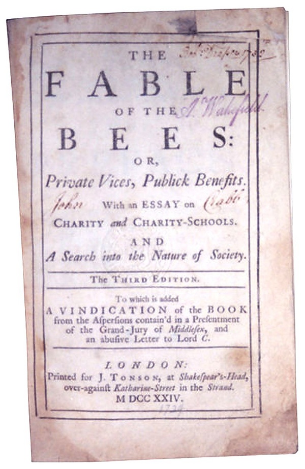 В работе английского экономиста Н. Барбона «Очерк о торговле» (1690)[2] утверждалось, что расточительность есть порок, способствующий торговле, а жадность, напротив, вредит коммерции. В художественной форме эту же идею выразил Бернард де Мандевиль в сатире «Ропщущий улей, или Мошенники, ставшие честными» (англ. The Grumbling Hive, or Knaves Turn’d Honest), изданной анонимно в 1705 году. В 1714 году так же анонимно вышло второе издание произведения под названием «Басня о пчёлах, или Пороки частных лиц — блага для общества» (англ. The Fable of The Bees: or, Private Vices, Public Benefits), в которой доказывается в аллегорической форме, что общество, решившее ради сбережений расстаться с роскошью и сократить вооружения, ждет печальная участь. Второе издание было дополнено двадцатью примечаниями, в которых Мандевиль развивает философский смысл наиболее важных мест басни. «Басня о пчелах» при жизни Мандевиля была много раз переиздана и имела множество приложений. Последнее издание датируется 1732 г. Решением суда присяжных английского графства Мидлсекс в 1723 году басня была признана вредной.