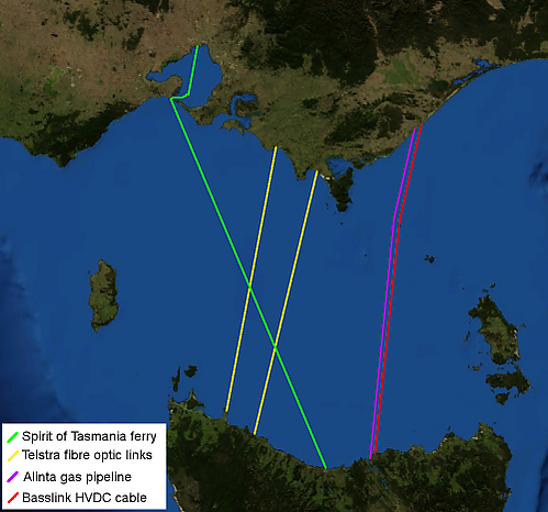 Подводный электрический кабель через Бассов пролив эксплуатируется с 2006 года. Он способен пропускать до 630 мегаватт электроэнергии. Первый подводный кабель связи через Бассов пролив был проложен в 1859 году. Он начинался от мыса Отвей в Виктории, затем проходил через остров Кинг и остров Три-Хаммок, и заканчивался у мыса Стэнли в Тасмании. Далее уже воздушной линией электроэнергия поступала в Джорджтаун в Тасмании. Однако, через нескольких недель после ввода в эксплуатацию начали происходить проблемы с коммуникацией, а к 1861 году кабель полностью пришел в негодность. Тасмания в настоящее время соединена с материком двумя оптоволоконными кабелями, управляемыми Telstra. С 2006 года также проложена высоковольтная линия постоянного тока Basslink.