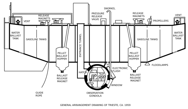 - На поверхности батискаф удерживается за счёт отсеков, заполненных бензином и благодаря тому, что цистерны водяного балласта, шахта для посадки экипажа в гондолу и свободное пространство в бункерах с дробью заполнены воздухом.