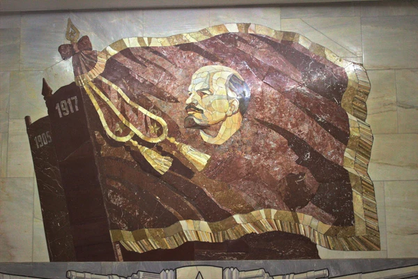 В торце станции сооружён аванзал, в котором пилоны отличаются от пилонов центрального зала. Торцевую стену в конце 1945 года украсило мраморное панно с изображением знамён и профилей Сталина и Ленина. В 1963 году кусок знамени с профилями решили убрать и заменить на портрет Ленина.[12] Мозаику выполнил художник-монументалист А. Т. Иванов, который в 1953 году делал мозаики на станции метро Киевская-кольцевая. Вентиляционные отверстия скрыты фигурными бронзовыми и мраморными решётками. Светильники в центральном зале располагаются за широкими карнизами в 4 ряда — непосредственно над пилонами и на своде[12].